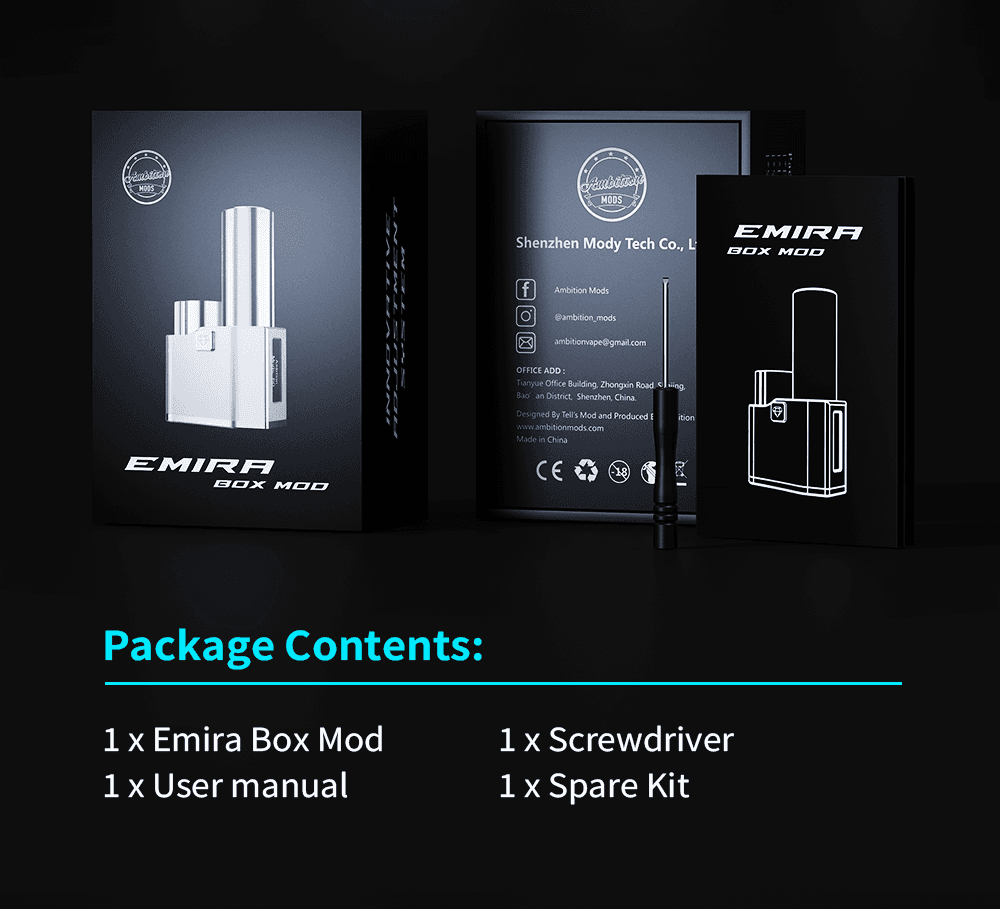 Το Emira Box Mod είναι το αποτέλεσμα της συνεργασίας της Ambition Mods με την Telli’s Mod και ξεχωρίζει για τον κομψό σχεδιασμό, την αξιοπιστία και την προσαρμοστικότητά του. Χάρη στον ρυθμιζόμενο 510 connector, μπορεί να υποστηρίξει άψογα διαφορετικούς ατμοποιητές, προσφέροντας τέλεια εφαρμογή και σταθερότητα.