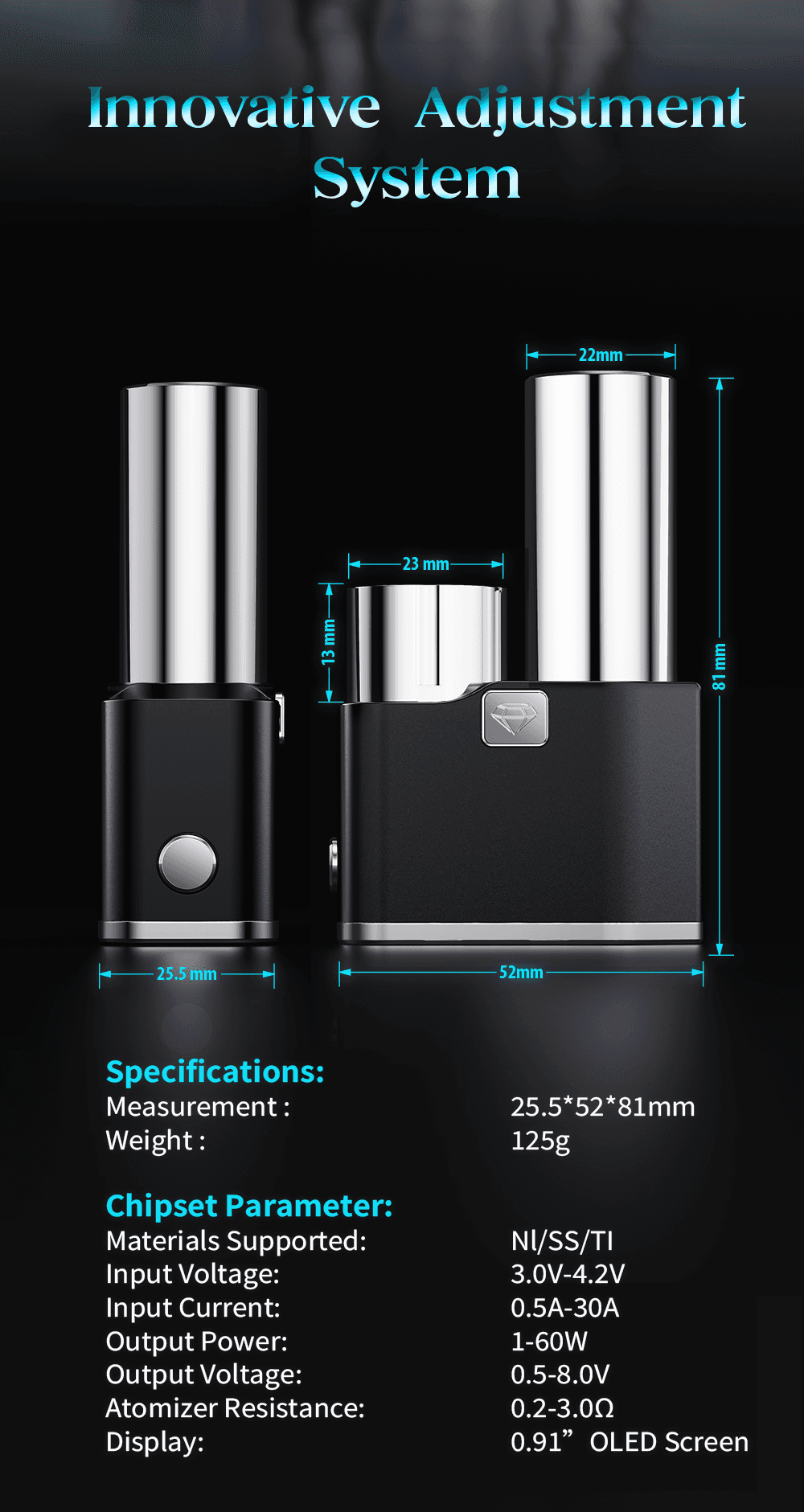 Με ισχύ εξόδου 1–60W και λειτουργίες όπως Constant Power Mode, Temperature Control (Ni, 316L, Ti), Universal TC Mode και Simulated Mech Mode, καλύπτει τόσο αρχάριους όσο και προχωρημένους ατμιστές που αναζητούν απόλυτο έλεγχο και αίσθηση.