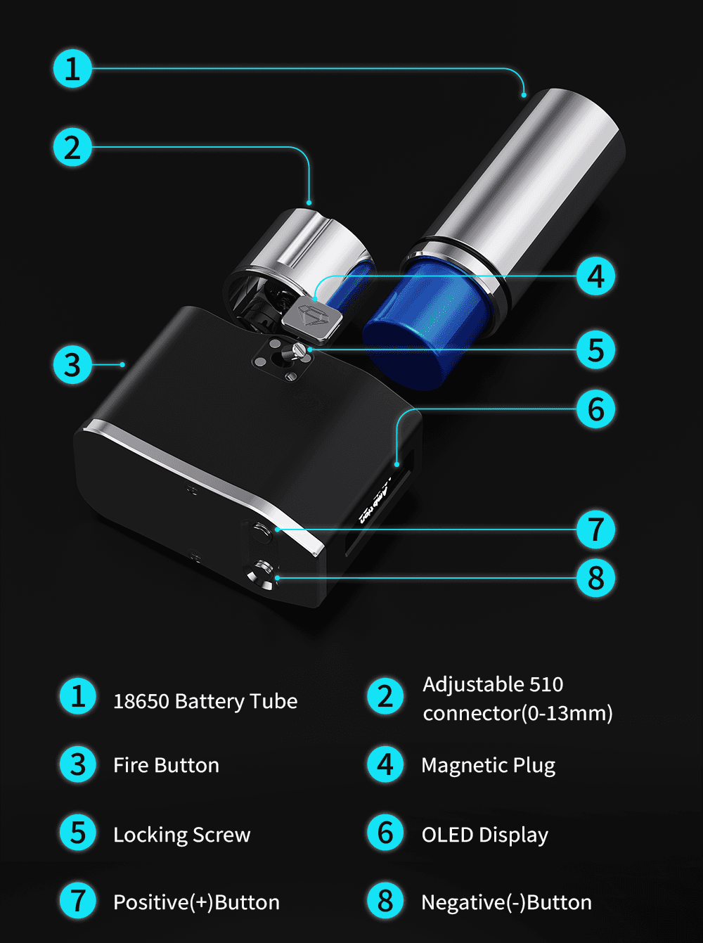 Συμβατό με μπαταρίες 18650, 18500 και 18350 (με το σωληνάκι για 18650 να περιλαμβάνεται), προσαρμόζεται εύκολα στις ανάγκες κάθε ατμιστή, είτε προτιμά πιο compact setup είτε μεγαλύτερη αυτονομία.