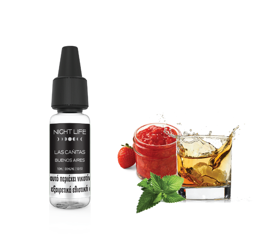 Night Life Las Canitas 10ml – Απολαύστε το δροσερό και γλυκό cocktail Las Canitas σε κάθε στιγμή της ημέρας. Ένας γευστικός συνδυασμός από πλούσιο πουρέ φράουλας, εμπλουτισμένος από ξύσμα φρέσκιας μέντας που δένει απόλυτα με τη διπλή δόση από παγωμένο ρούμι.