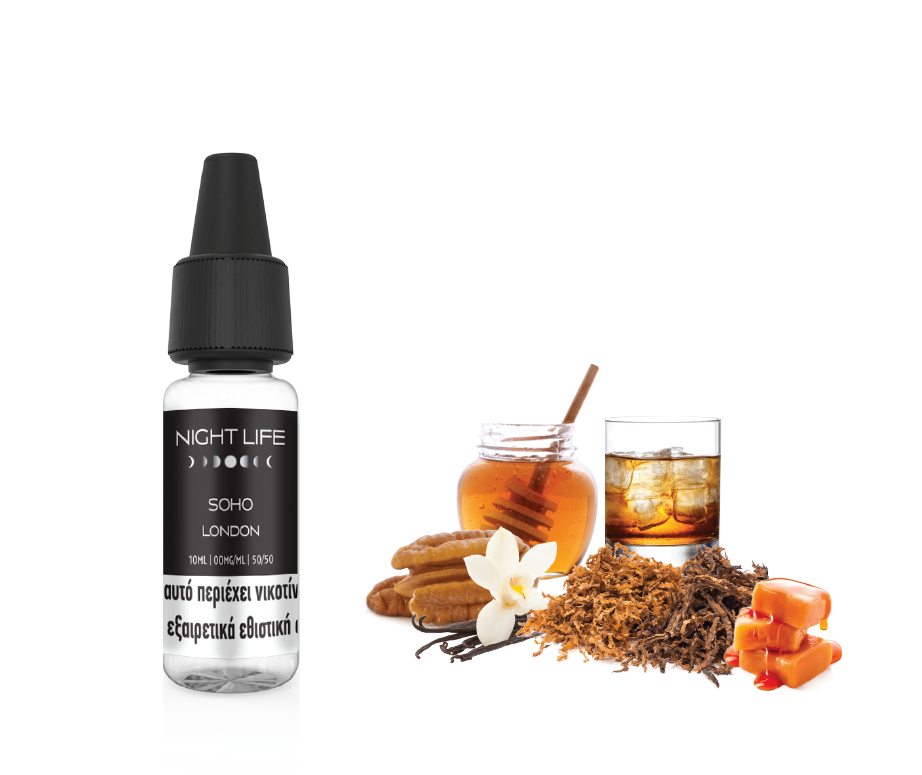 Night Life Soho 10ml – Ένα ‘’αυστηρά’’ καπνικό υγρό, που συνδυάζει γεύση υψηλής ποιότητας από Ανατολή και Δύση. Το παλαιωμένο Bourbon σε συνδυασμό με τόνους λιωμένης γαλλικής καραμέλας, μυρωδάτης βανίλιας Μαδαγασκάρης και μελωμένου καρυδιού Πεκάν, καθιστούν το Soho ως ένα μοναδικό ισορροπημένο καπνικό μείγμα που υπόσχεται μια διαφορετική αίσθηση απ’τά συνηθισμένα.